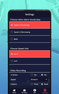 - From ‘Choose When Alarm should play’, app user can control when alarm will play: 'Speed is increasing' , 'Speed is decreasing' Or 'Both'